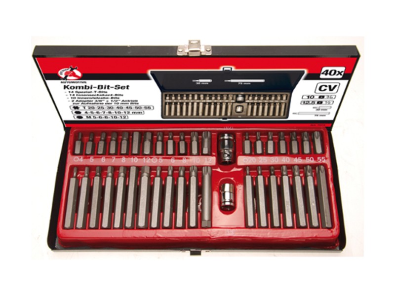 - bitovi, dužina 75 mm spoljni šestougaoni pogon 10 mm (3/8"), T-profil (za Torx): T20 - T25 - T30 - T40 - T45 - T50 - T55