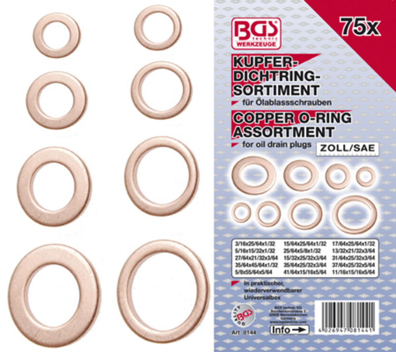 > > > > Asortiman zaptivnih prstenova | Bakar | Veličine u inčima | za vijke za ispuštanje ulja | 75 kom. (B8144)