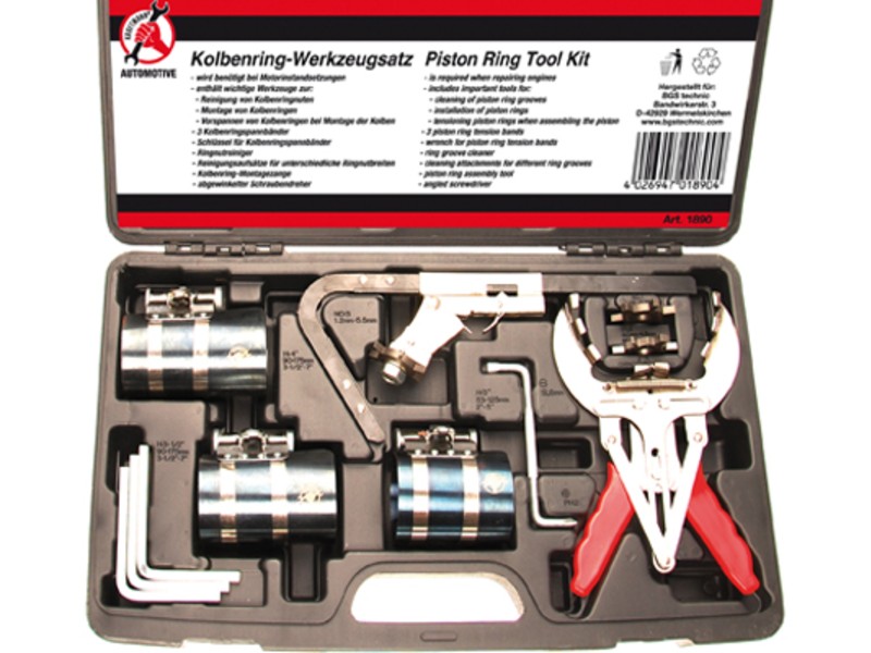 sadrži važan alat za čišćenje prstenova klipova, montažu prstenova klipova, predzatezanje prstenova klipova kod montaže klipova