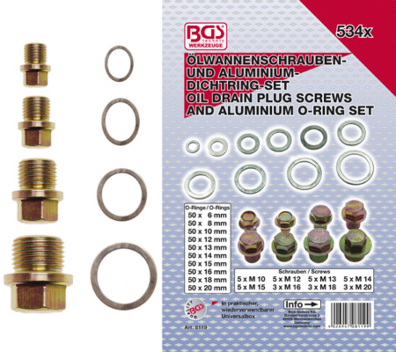 Asortiman vijaka i aluminijumskih zaptivnih prstenova za posudu za ulje | 534 kom.