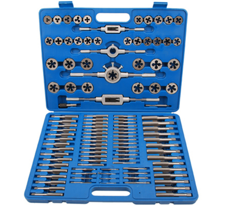 • po 35 svrdla za navoje, glavni rezač, krajni rezač i metalna oštrica u sledećim veličinama i sa sledećim koracima: 4"-40UNC - 6"-32UNC - 8"-32UNC - 10"-24UNC - 10"-32UNF - 12"-24UNC - 1/4"-20UNC - 1/4"-28UNF - 1/4"-24UNS - 1/4"-32UNS - 5/16"-18UNC - 5/16"-24UNF - 3/8"-16UNC - 3/8"-24UNF - 7/16"-14UNC - 7/16"-20UNF - 1/2"-13UNC - 1/2"-20UNF - 9/16"-12UNC - 9/16"-18UNF - 5/8"-11UNC - 5/8"-18UNF - 3/4"-10UNC - 3/4"-16UNF - M6 x 1,0 - M8 x 1,25 - M10 x 1,5 - M10 x 1,0 - M11 x 1,5 - M12 x 1,25 - M12 x 1,75 - M14 x 1,25 - M18 x 1,5 - 1/8"-27NP - 1/4"-18NPT